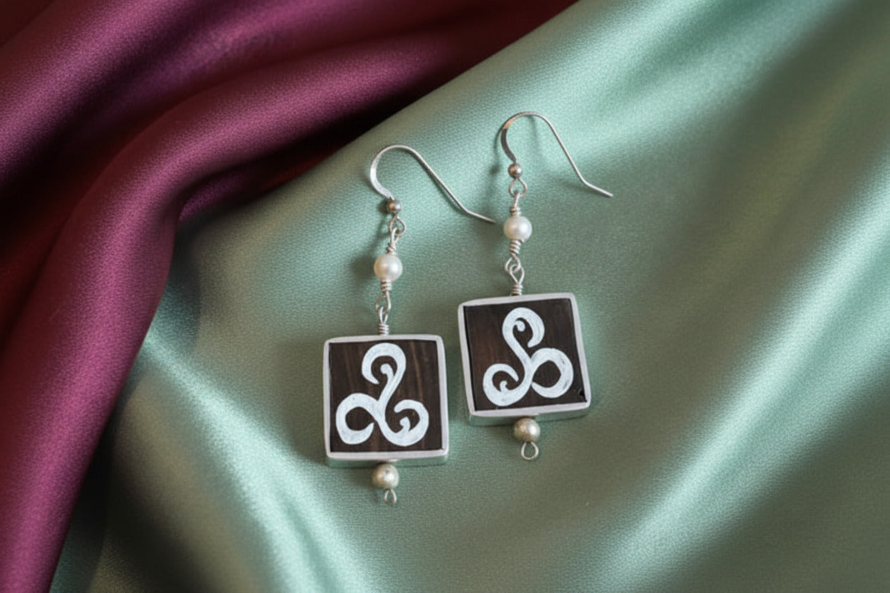 Hand Painted White Symbol on Ebony Square Earrings with Pearls