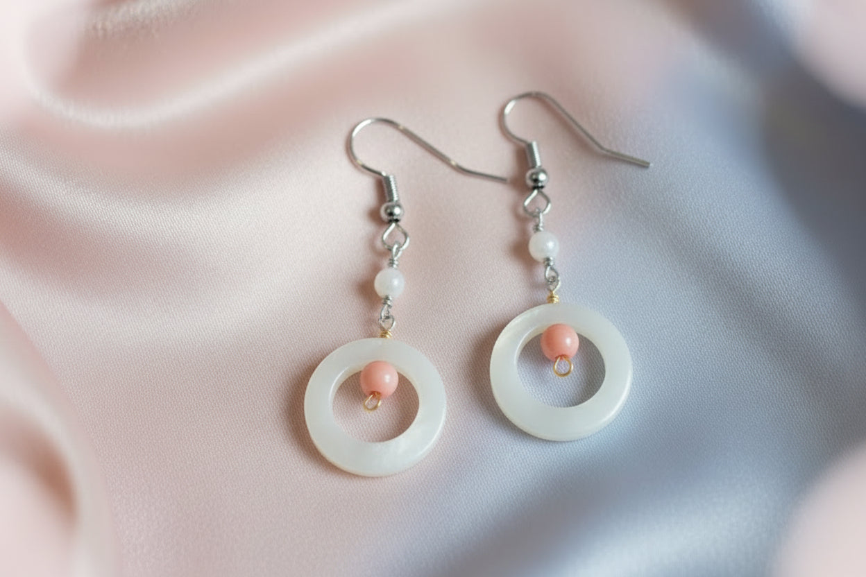 White 'Shell' Circle Earrings with Pink Beads by Jamie Barthel