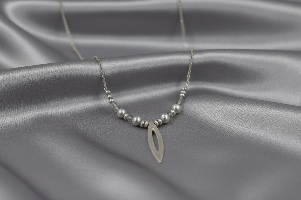 Sterling Silver Open Marquis on grey pearl and labradorite necklace.  J & I Jewelry is designed by Ian Gibson and completely handmade in a wonderful studio in the heart of Philadelphia.  Completely self taught in the art of jewelry fabrication, Ian's fascination with metals formed from a schooling in geology and a desire to work with his hands.  Combining precious metals with gemstones and pearls, he seems to create designs which are organic and have an artisan essence.  His commitment to his craft is never ending and his creations mirror this evolution.  After settling their traveling bags down, Jessica and Ian founded J & I Jewelry in 1999.  They are joined in the Philadelphia studio by a talented staff of local artisans.   The studio is filled with the sound of hammers, sanders and laughter, and every person makes each piece as if it were a gift for someone dear to them.