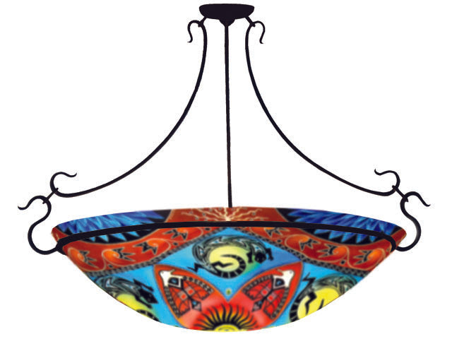 Santa Fe is a magical place to visit. Now, you can have a chandelier that embodies images and scenery from Santa Fe to admire year-round! From the color palette's burnt sienna of the red rocks and ultramarine shades of the bright blue skies, to the native American depictions, this highly stylized chandelier is perfect for any admirer of the southwest and its cultures and scenery. A one-of-a-kind masterpiece handcrafted by acclaimed artist Jamie Barthel in her Woodstock, NY studio.