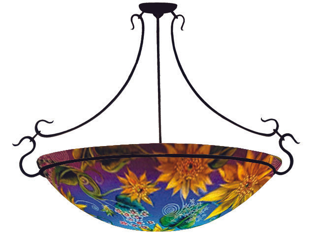 Sunflower is a cheery, vibrant design. It features a collection of varieties of bright, yellow flowers atop a gradient background of violet to turquoise blue. If you are looking for a pop of color in your space, the Sunflower chandelier delivers. It's an instant mood lifter! A one-of-a-kind masterpiece handcrafted by acclaimed artist Jamie Barthel in her Woodstock, NY studio.