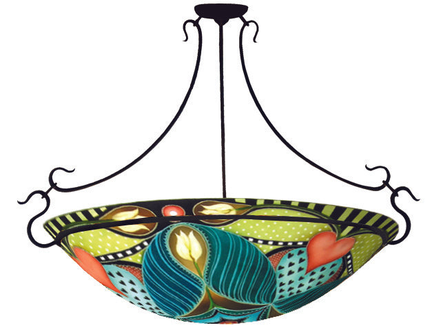 Materials: High-quality, hand slumped glass with reverse hand-painting; metal fixtures (Semi-flush and Rod Hardware available in 4 finishes: Gunmetal Black, Matte Black, Antique Bronze or Brushed Pewter. Ring Hardware available in Matte Black).