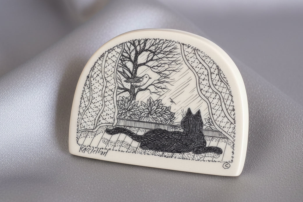 Each unique design combines the ancient art of scrimshaw done long ago by American whalers with the modern usage of resin material. Lines are cut in with a sharp scribe. Ink is then rubbed into each hand engraved original to "expose" the image.