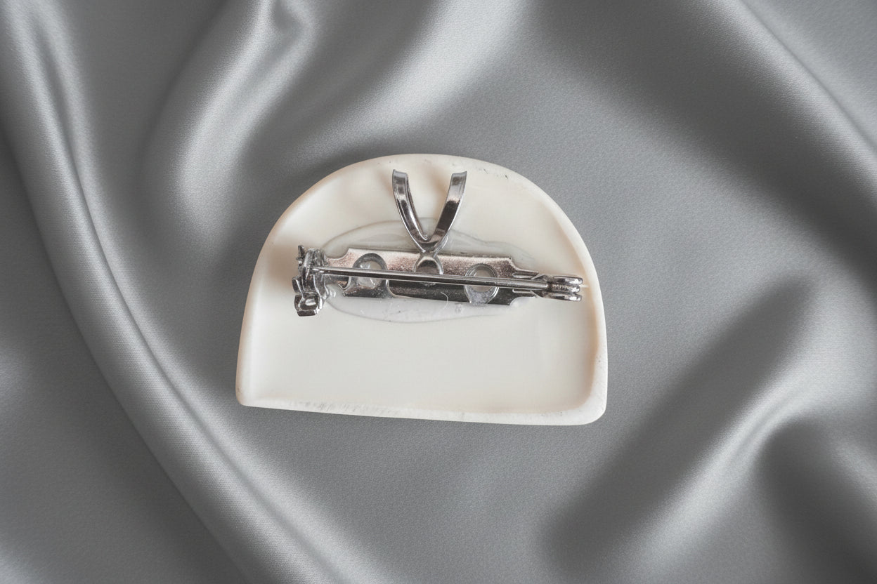 Approximately 1" high. Can be worn as a pin, or put add a chain to wear as a necklace! Intricately Engraved Art pieces cast in sculpting resin from an original fossil engraving. Artists Kim and Katherine McClelland create each design in their Ohio studio, purchasing their ancient materials to engrave on from the Yupik Eskimos in Alaska.