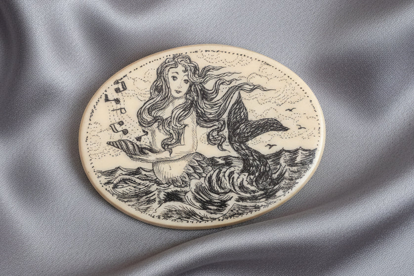 Each unique design combines the ancient art of scrimshaw done long ago by American whalers with the modern usage of resin material. Lines are cut in with a sharp scribe. Ink is then rubbed into each hand engraved original to "expose" the image.