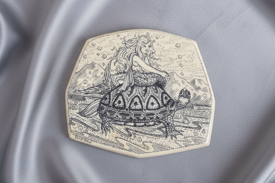 Each unique design combines the ancient art of scrimshaw done long ago by American whalers with the modern usage of resin material. Lines are cut in with a sharp scribe. Ink is then rubbed into each hand engraved original to "expose" the image.